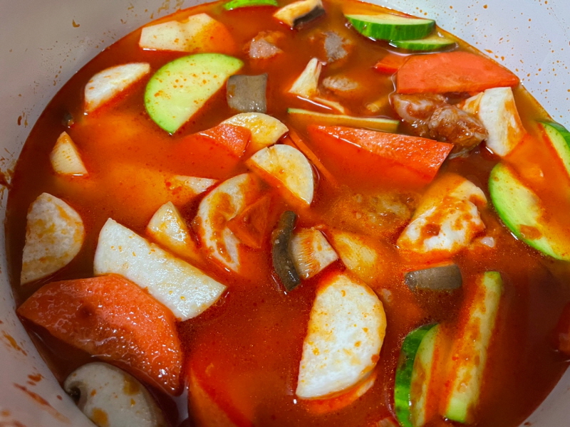 8. ๊ตญ๋ฌผ ๋ง์ ๋ด์ค ์ฌ๋ฃ๋ฅผ ์ค๋นํฉ๋๋ค. ๊ฐ์ฅ 2์คํผ, ๊ณ ์ถง๊ฐ๋ฃจ 2์คํผ, ์๋ฃฐ๋ก์ค 3์คํผ, ๋ค์ง ๋ง๋ 1์คํผ, ์ฒญ์๊ณ ์ถ 0.5์คํผ์ ๋ฃ์ต๋๋ค. ๋ง์ ๋ณด์๊ณ ์กฐ๊ธ ๋ ๋งต๊ฒ ๋จน๊ธฐ๋ฅผ ์ํ์๋ฉด ์ฒญ์๊ณ ์ถ๋ฅผ ๋ ๋ฃ์ด์ฃผ์ธ์. ์งํ ๋จ๋ง์ ์ํ์ง ์์ผ์๋ฉด 3์คํผ์์ 2์คํผ์ผ๋ก ์กฐ์ ํด ์ฃผ์ธ์.