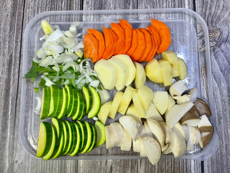 2. ์ฌ๋ฃ๋ฅผ ์์งํฉ๋๋ค. ์ ํธ๋ฐ, ๊ฐ์, ๋น๊ทผ, ์์ก์ด๋ฒ์ฏ, ๋ํ๋ฅผ ์ ๋นํ ์ฐ์ด์ฃผ์ธ์. (๋ผ์ง๊ณ ๊ธฐ๋ ์ฐ๊ฐ์ฉ์ผ๋ก ๊ตฌ์ ํ๊ธฐ ๋๋ฌธ์ ๋ฐ๋ก ์๋ฅด์ง ์๊ณ ๊ทธ๋๋ก ์ฌ์ฉํฉ๋๋ค)