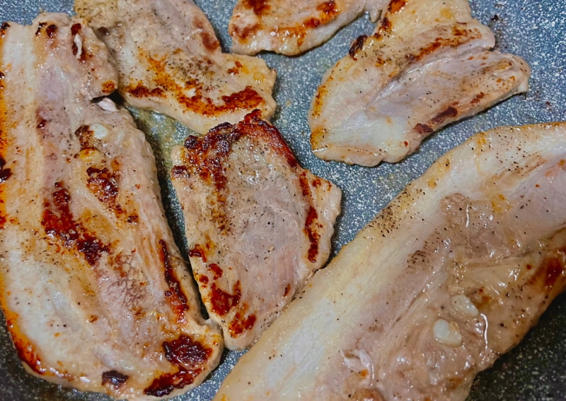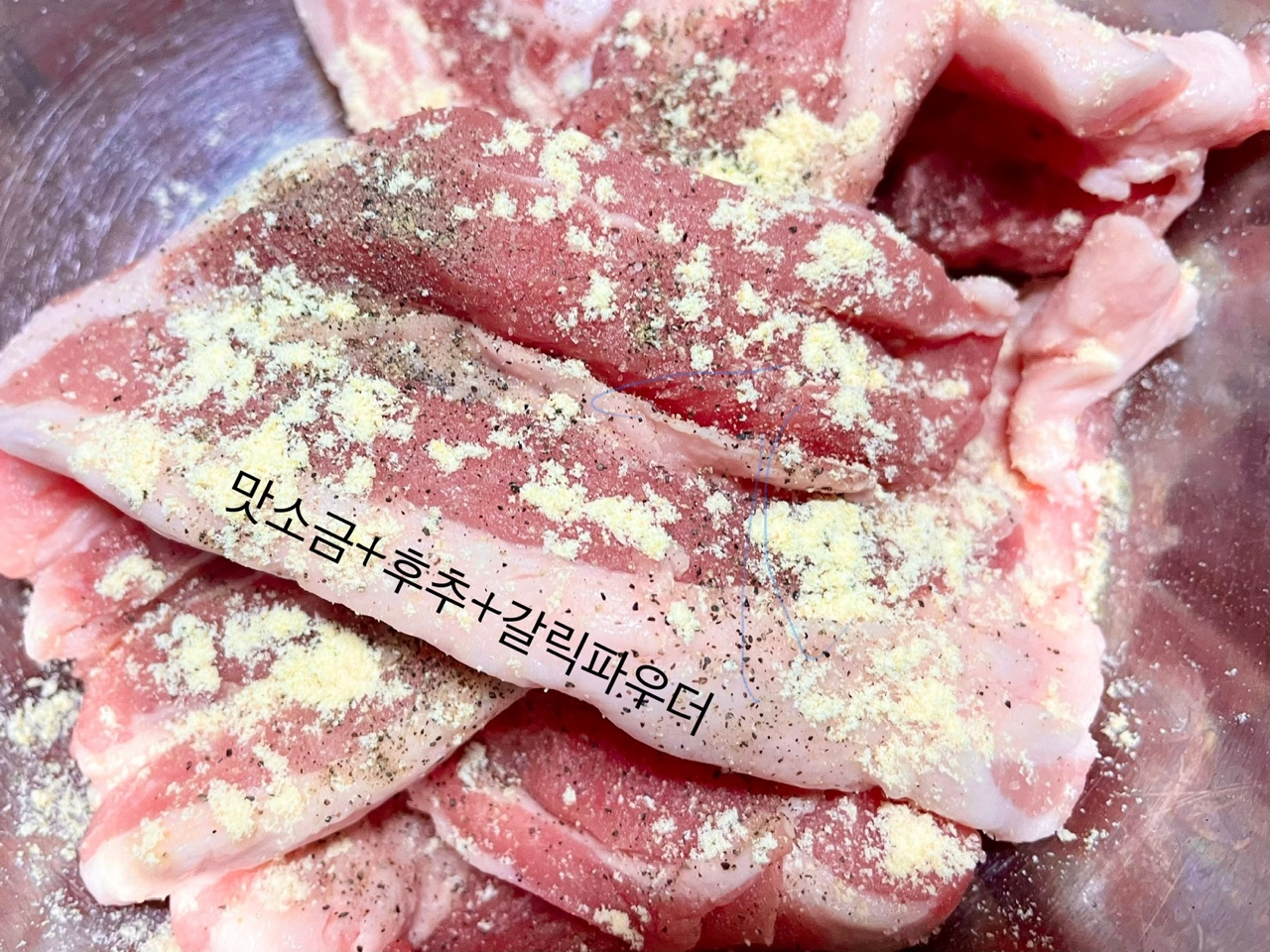 2. ๋ผ์ง๊ณ ๊ธฐ์ ์์ฆ๋์ ํด์ค๋๋ค. ๋ผ์ง๊ณ ๊ธฐ๋ฅผ ๋ง์๊ธ ์กฐ๊ธ, ํ์ถ ์กฐ๊ธ, ๊ฐ๋ฆญํ์ฐ๋๋ฅผ ๊ณจ๊ณ ๋ฃจ ๋ฟ๋ฆฌ๊ณ ๊ธฐ๋ค๋ ค์ค๋๋ค.