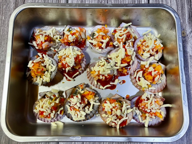 6. 한쪽을 뜯어낸 가리비 위에 작게 잘라준 야채를 올려주고 그위에 초고추장을 뿌립니다. 그리고 마무리 단계로 모차렐라 치즈를 올립니다.